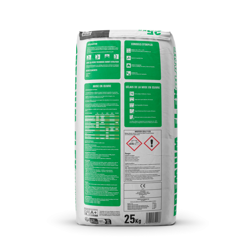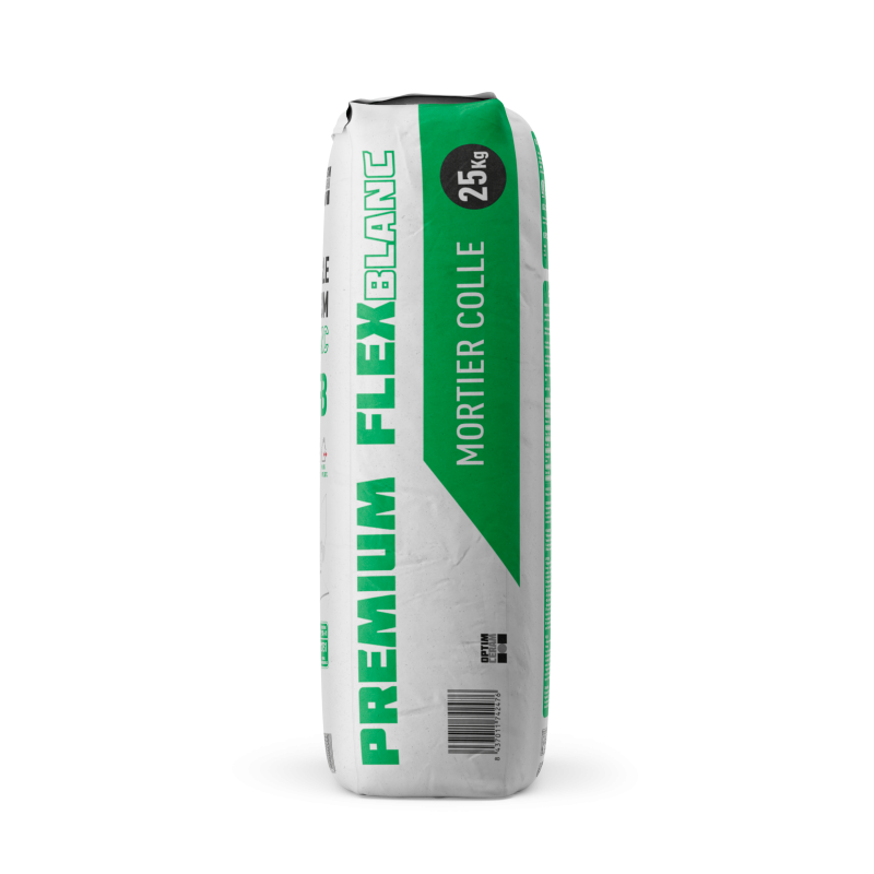 Mortier colle premium flex blanc amélioré de classe C2TES1 pour la pose de carrelage intérieur et extérieur.