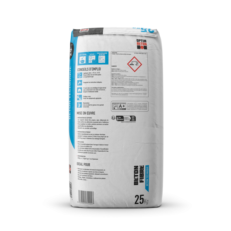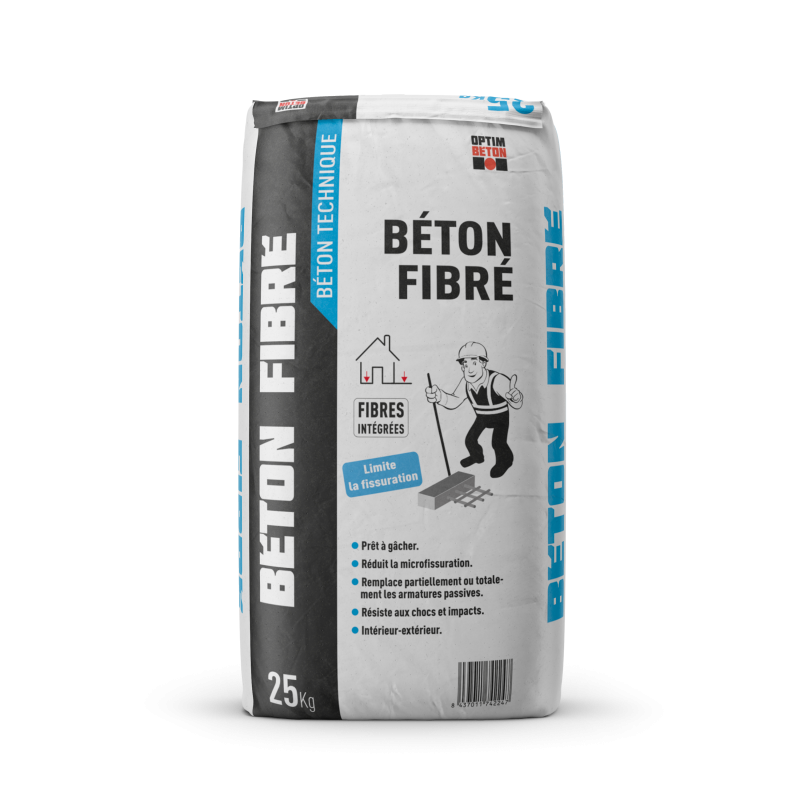 Béton sec prêt à l’emploi composé de sable, de gravillons, de ciment, de fibre et d’adjuvants spécifiques. De par ses propriétés c’est un béton idéal pour la réalisation de travaux de maçonnerie, en intérieur et extérieur, exposés aux chocs et impacts, donnant une meilleure plasticité, réduisant la microfissuration par la présence de fibres.