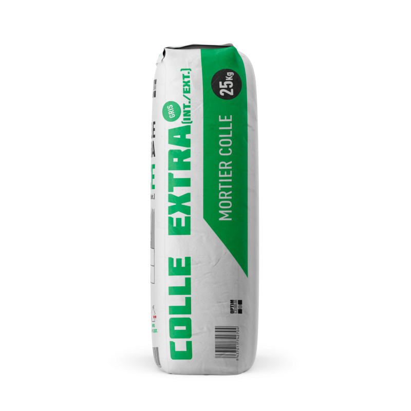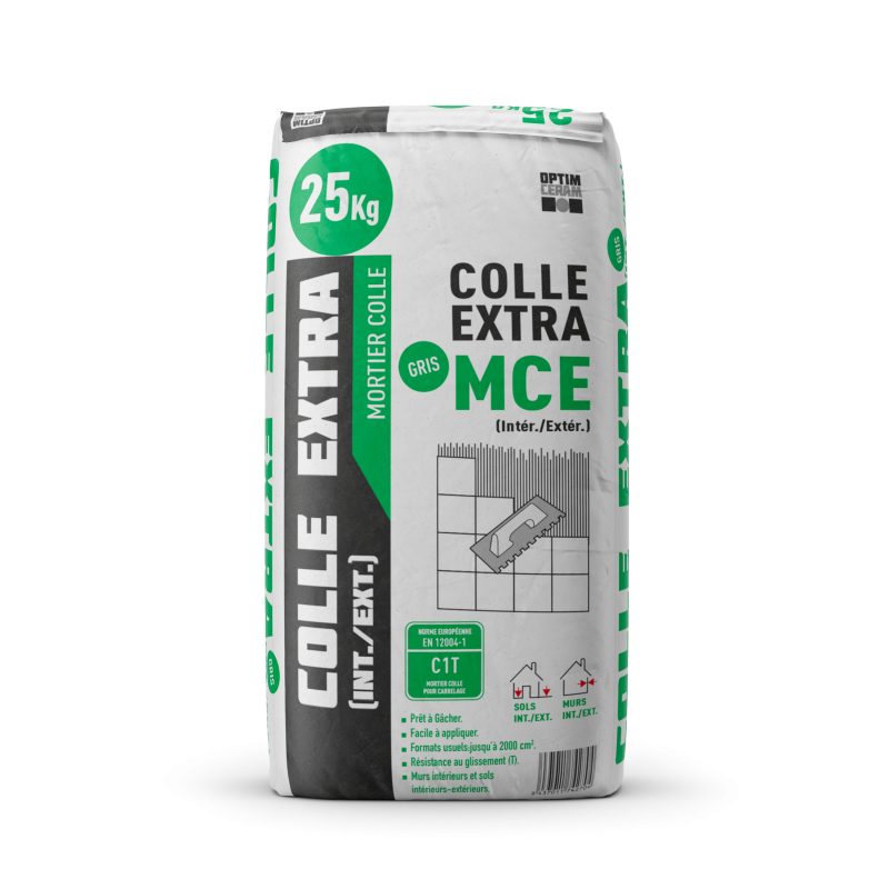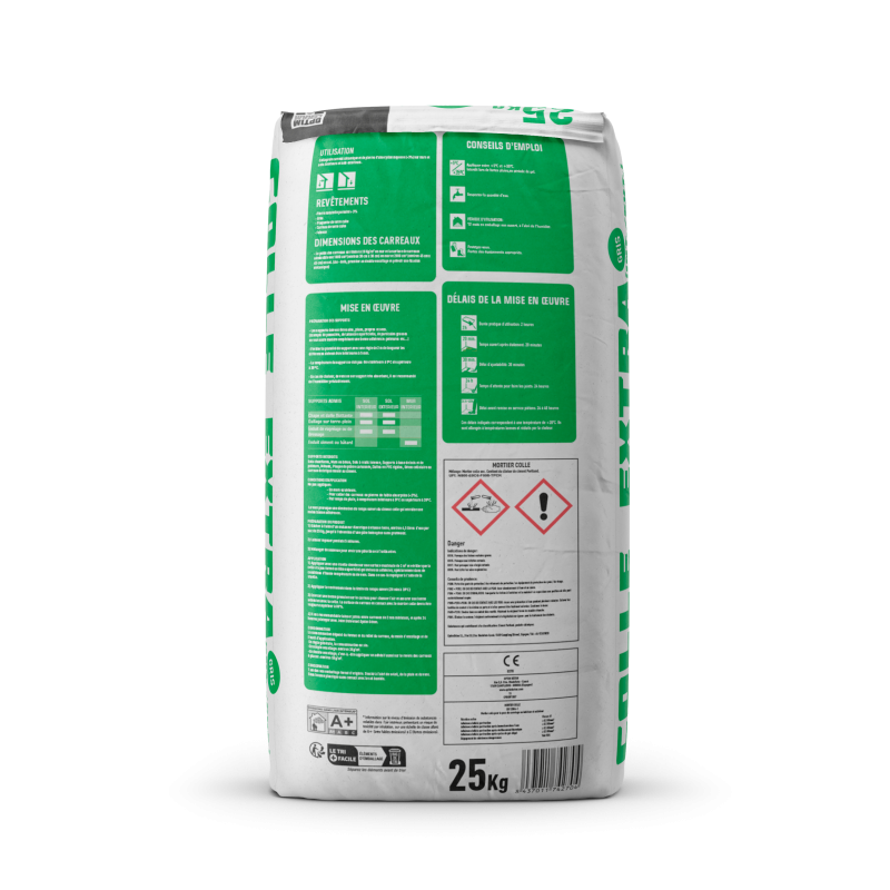 Mortier colle extra de classe C1TE pour carrelage, en murs et sols intérieurs et sols extérieurs.