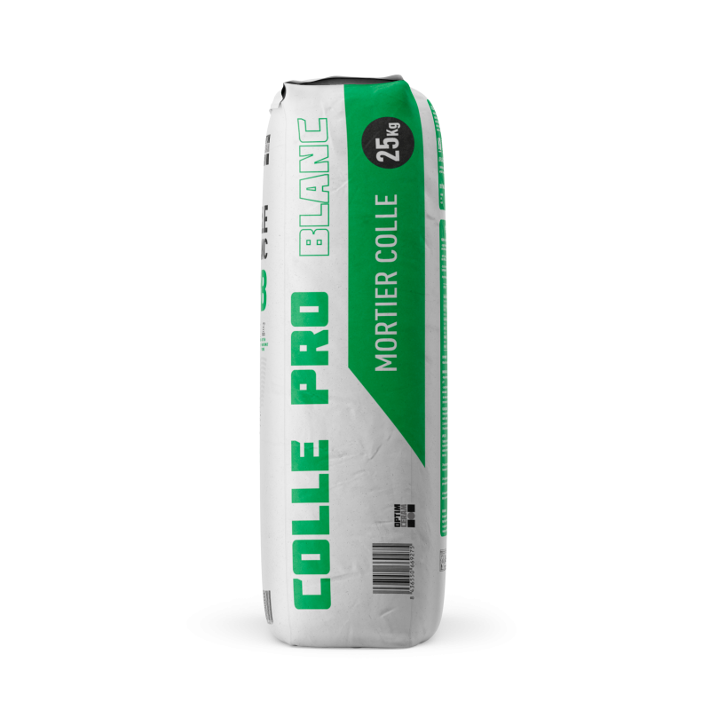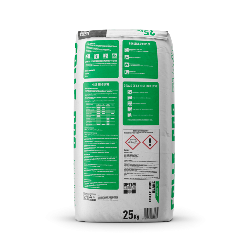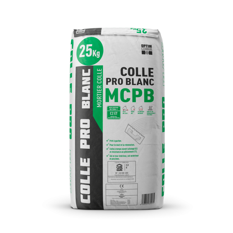Mortier colle pro blanc amélioré de classe C2TE pour la pose de carrelage de grand format sans porosité.